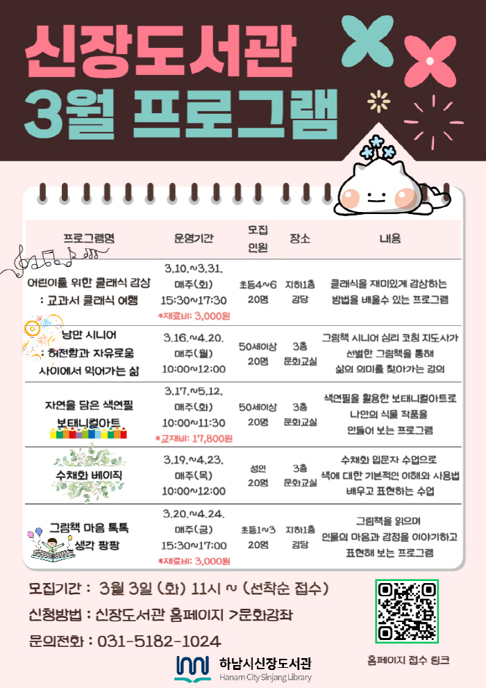 | 내용 | ★공지사항★ -1인 교재비: 3,000 필요 *추후 참여자 대상 개별 공지 예정 -올해부터 불참자 대상 패널티가 부여되오니 프로그램 신청 전 참고해주시면 감사드리겠습니다. ---> [패널티 내용 자세히 보기 클릭] ![]() |