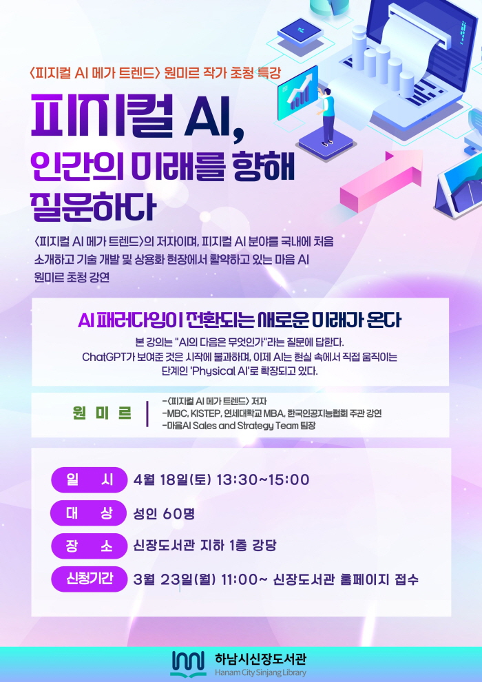 | 강좌명 | [성인] 원미르 작가와의 만남 - 피지컬 AI, 인간의 미래를 향해 질문하다 |