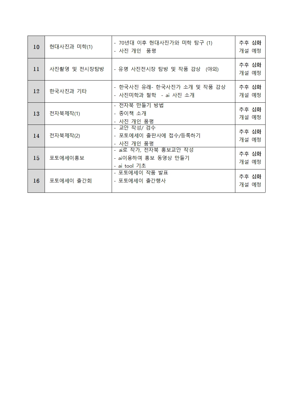 | 강좌명 | 사진 기술과 사진 미학: 포토에세이 창작의 기초 | |