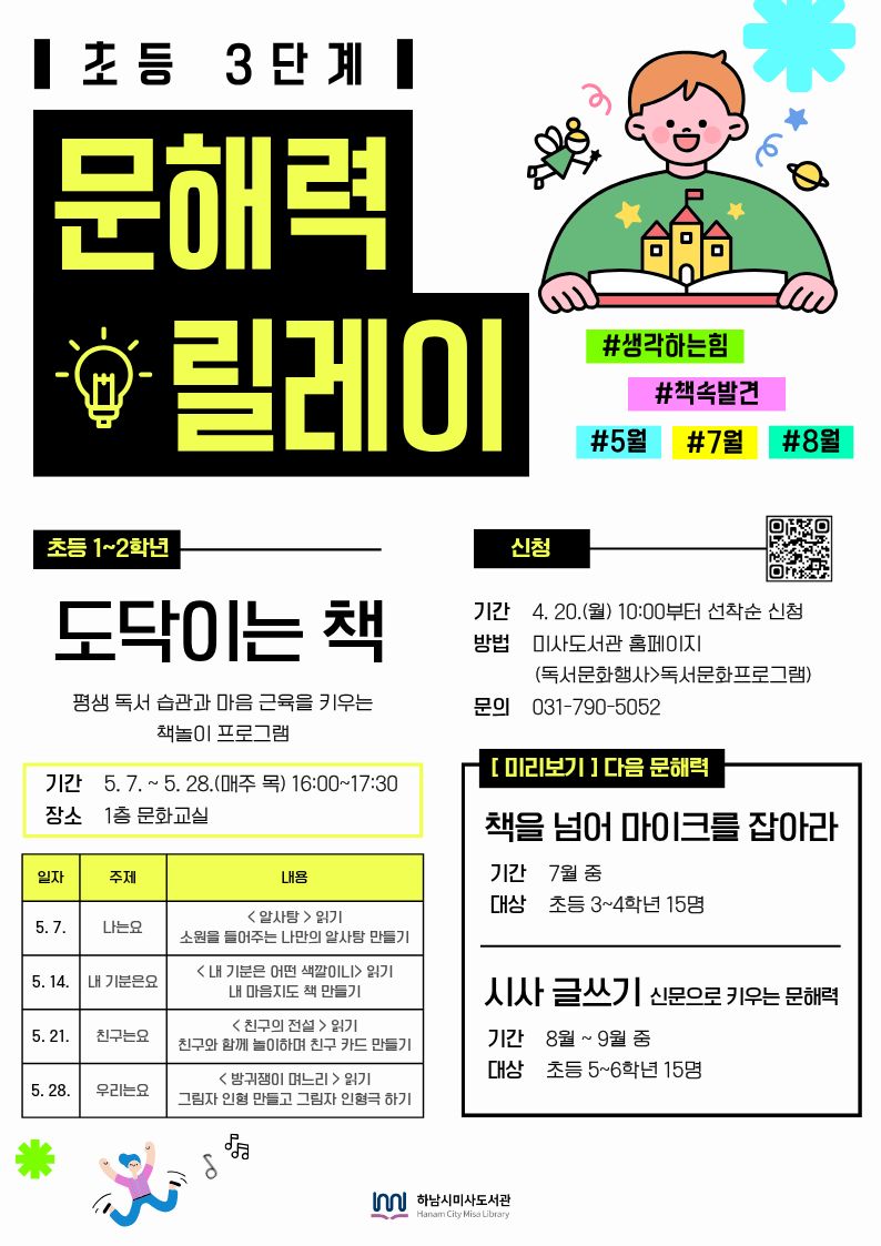 | 내용 | ※ 수강 자녀 아이디로 신청바랍니다. (보호자 아이디로 신청할 경우 비고에 자녀이름, 생년월일을 꼭 적어주시기 바랍니다) ※ 당일 취소 및 프로그램 출석률 70% 미만일 경우(본 프로그램은 4회차로 2회 이상일 경우) 하남시립도서관 행사/프로그램 신청 1개월(30일)간 제한됩니다. ※ 프로그램 참여 시 도서관 홍보를 위한 촬영 및 활용에 동의하는 것으로 간주됩니다. ※ 미사도서관 주차는 1시간 무료이며, 이후에 발생되는 주차비용은 자부담입니다. |
