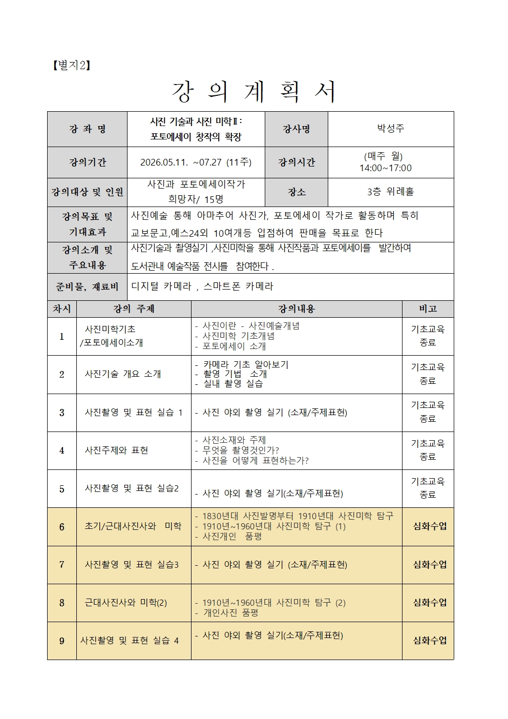 강좌명 사진 기술과 사진 미학Ⅱ: 포토에세이 창작의 확장