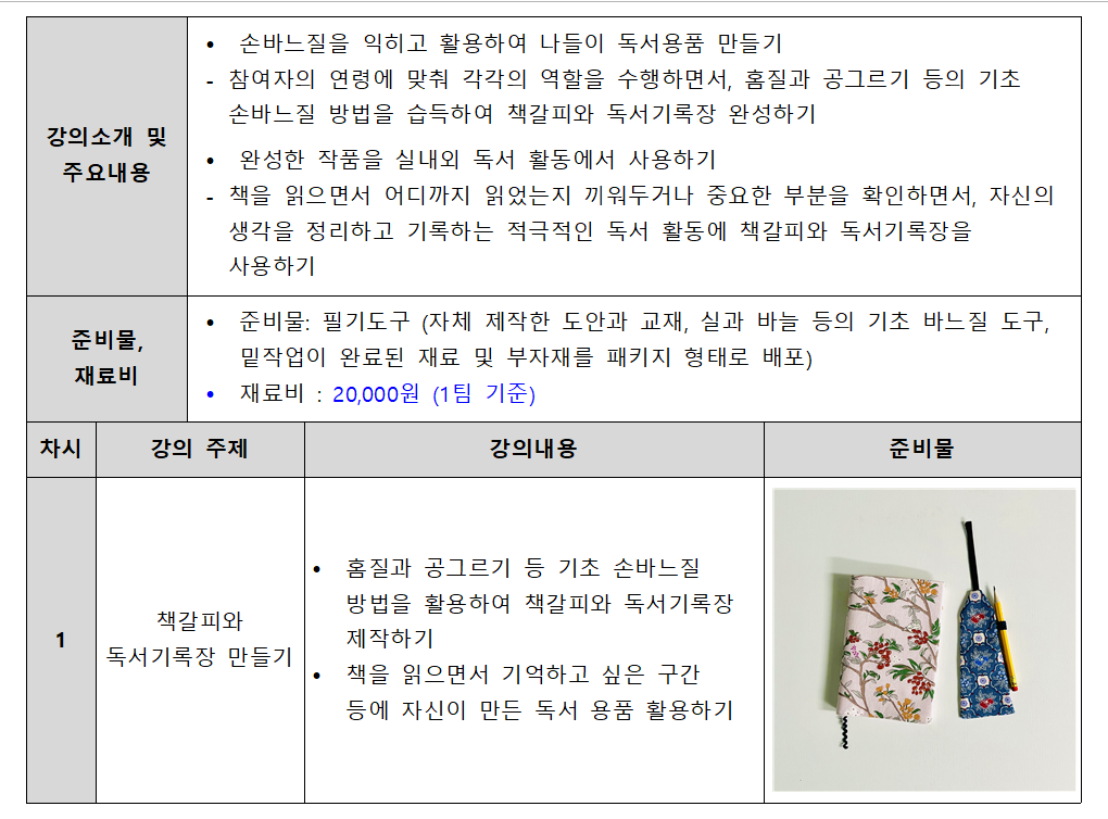 강좌명 [초4~6 및 부모님] 나들이 용품 만들기 2탄 - 책갈피와 독서기록장 만들기