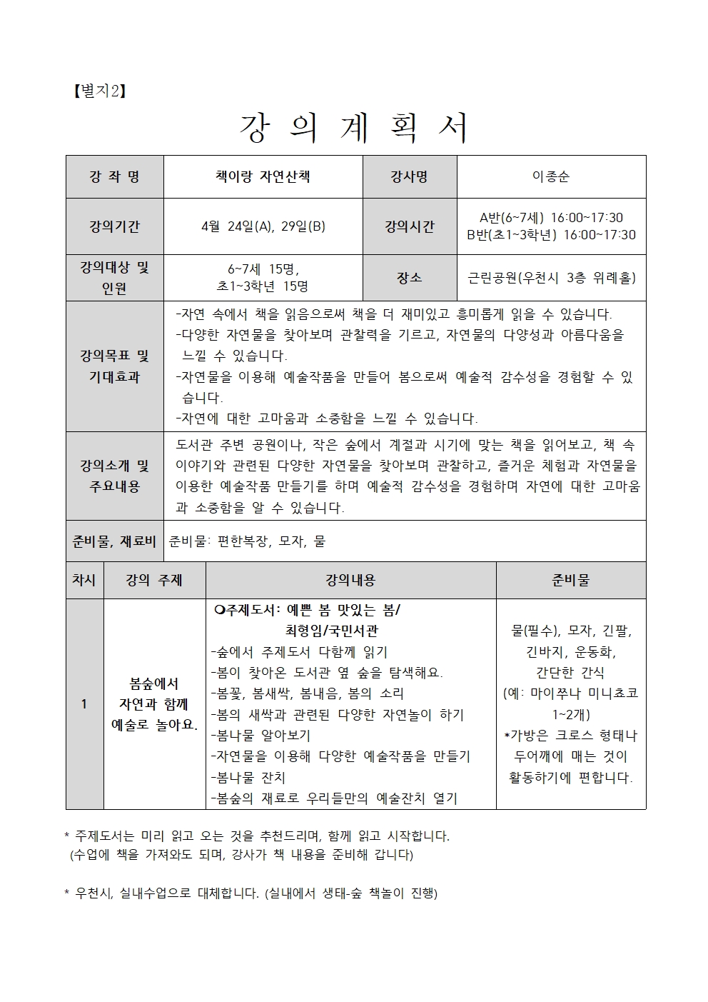 | 강좌명 | 책이랑 자연산책 A | ||