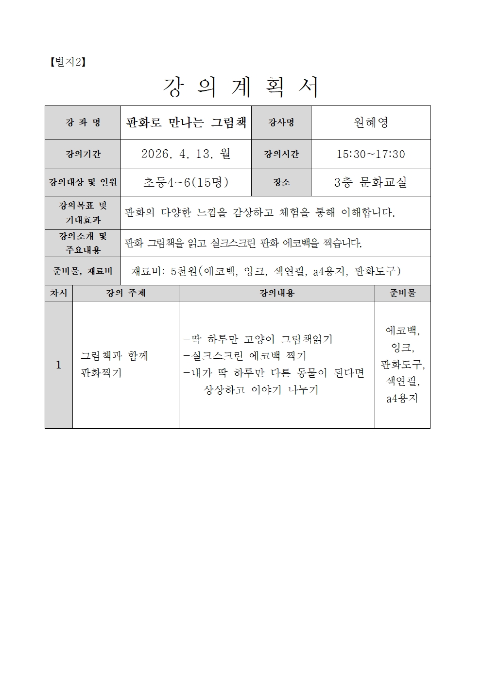 강좌명 <어린이 판화 특강> '딱 하루만 고양이' 작가와 함께하는 판화로 만나는 그림책
